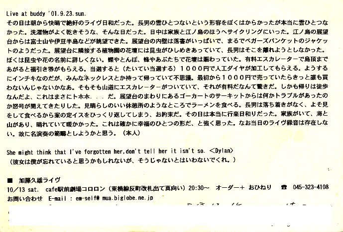 反町・駅前劇場コロロン 1st.stage 1. 構築の美 2. 痛まない心 3. グッバイ 4. 地下街を通って 5. ノスタルジア 6. ふとん 7. ウタの唄 8. 君の影、僕の灰 9. ありふれた恋の唄 10. 夜の愉しみ 2nd.stage 1. Good Bye Girl 2. 夜がやってくる 3. 時代劇 4. Sound Of Silence 5. ああ美しき哉、世界は 6. 君の裸 7. 横浜散歩記 8. 手に宿る死 ’01.11.27.tue. 野毛・あぐり 1. Good Bye Girl 2. Is Your Love In Vein ? 3. 夜の愉しみ 4. 手に宿る死 ’01.12.16.sun. 伊勢佐木町・John John 1. Concrete Jungle 2. 夜の愉しみ |