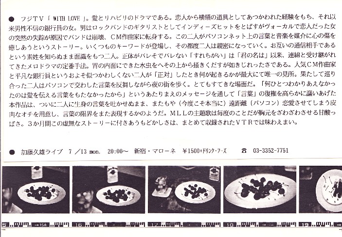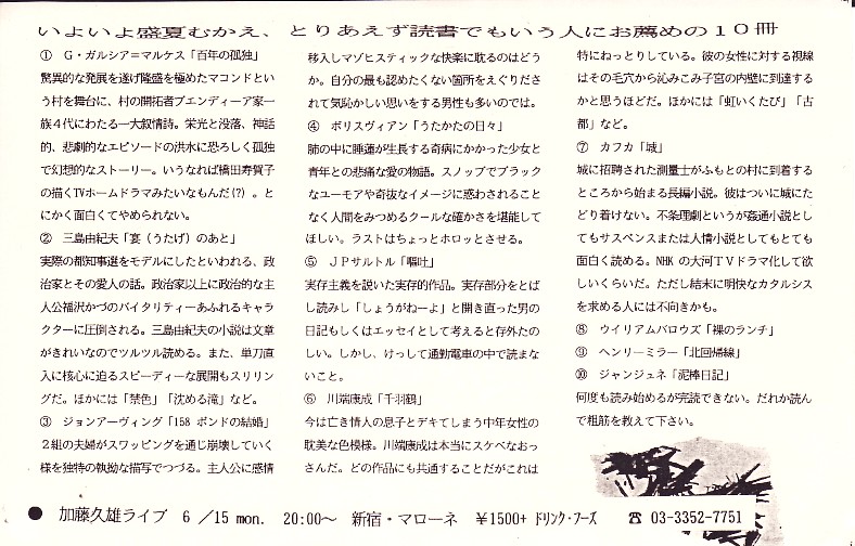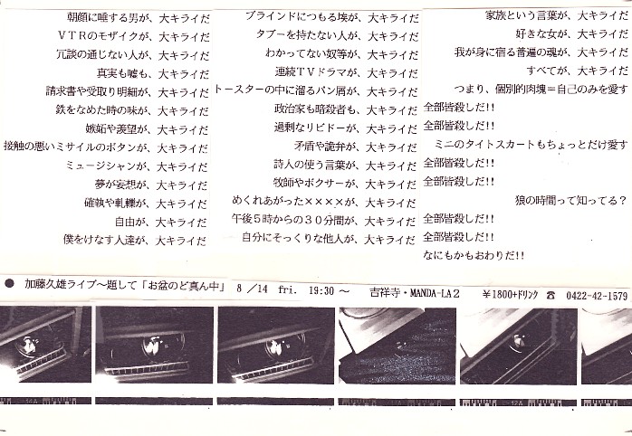 吉祥寺・MANDA-LA2 1. 扇風機は、なぜ廻らないのか? 2. Perfect Day(L.reed) 3. アプリコット・ハーブ 4. イエイ 5. 地下街を通って 6. 巨人の陥落 7. ああ美しき哉、世界は '98.12.31.thu. 三鷹・ストーリーズ 1. 教えてあげないよ 2. AV借りて家へ帰る 3. アプリコット・ハーブ 4. Just Like A Woman 5. 選れなきもの 6. 僕の村は戦場だった |