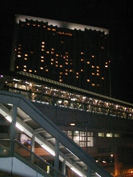 夜のお台場駅と、ホテルグランパシフィック メリディアン。