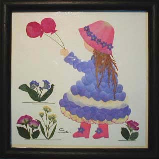 風船と帽子と靴はバラの花びら、洋服は紫陽花と
