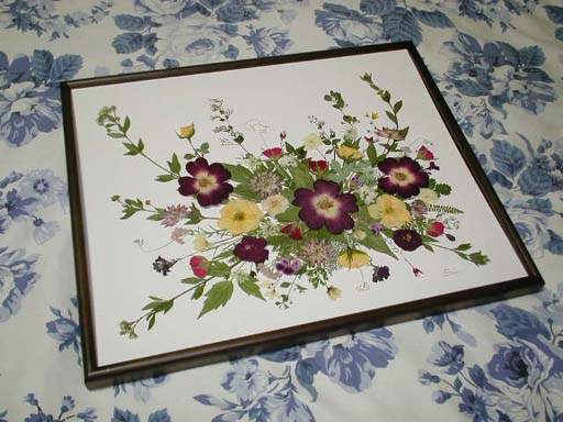 2006年1月の作品 カラフルな花をスクエアのデザインにしました。 一重のバラ、ミニバラ、フジバカマ、カラミンサ アストランテア、ペーパーカスケード、ゼラニューム などを使いました。