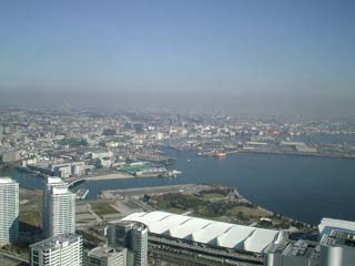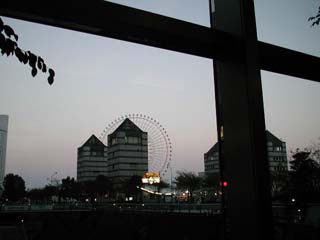 夕暮れ迫るロビーからのみなとみらいの眺めです。