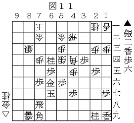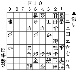以下、△1五歩▲2六桂△2五銀▲6七角△6九龍▲6三歩△同歩▲9二竜△1六歩▲1八歩△1二香打と進んで図10。端を狙った山元に対して、▲2六桂〜▲6七角と打って▲3四桂を狙ってきた先手だったが、△6九龍とされると6六の馬が浮いているので▲3四桂とはできない。最終手△1二香打では△5五桂が勝るが、図10でも△5五桂が残り山元が良い。この後、少しよれたものの勝ちきった。