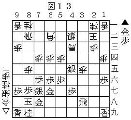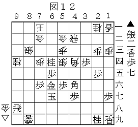 ▲9八飛とされると、後手は歩切れのため飛車成を防ぐためには駒を投入する必要がある。△9四桂と使わせたところで▲5七角とかわす。右辺が広い形となった図12はまだ難しいところもあるが逆転模様。以下、実力を遺憾なく発揮して勝ちきった。