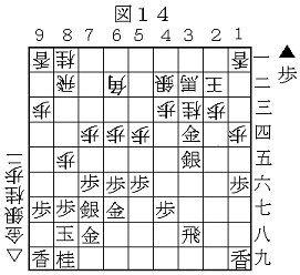 ここではまず、4将の栗本の将棋を見ていただく(栗本が先手)。相矢倉から仕掛けていって図13。ここでは攻めが切れ気味で栗本がやや不利だが、以下▲3四金△3二馬▲4四銀△4三歩▲3三歩△同桂▲3五銀(図14)と進み、攻めがつながり盛り返した。途中、後手の△4三歩が疑問手で、▲3三歩〜▲3五銀としておけば次の▲2四歩が厳しい。図14からは△8六歩▲同銀△6五歩▲2四歩△同歩▲2三歩△3一玉▲2四銀と進み、以下は快勝であった。