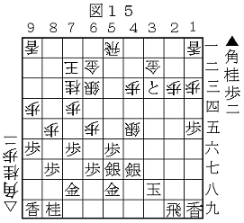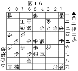 15図以下、△3五桂▲3六歩△4七桂成▲同金△5八角▲6八金△4七角成▲同玉△5五歩。(図16)