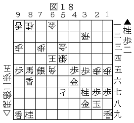 実戦は△8七歩▲同飛△6五角▲8四飛△同玉▲8六香△7五玉▲8五角成△64玉▲7五銀(図18)。なんと、後手玉が頓死してしまった。△6五角が敗着で、△8六歩〜△8五歩とされると先手が苦しい。松原にとっては幸運であった。