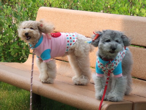 皆 ぐったりです ボッサリーノ〜ズも最近はお家ではお洋服を着ていませんが お出かけの時は日焼け対策? ( ̄m ̄* )ムフッ♪