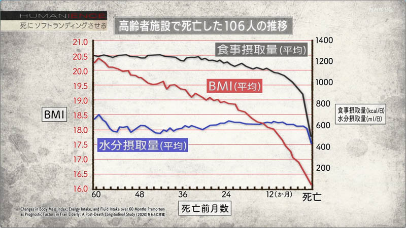 死亡した高齢者の、食事量と体重を調べると、充分に食事を摂っていても、体重が減っていたことがわかりました。