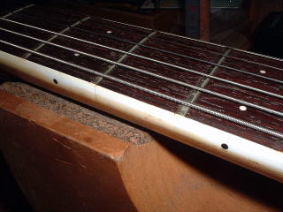 バインディングの溝に残った接着剤など取り除き、綺麗に整えていきます。バインディングを接着して形状を整えて塗装をして完成になります。今回の場合バインディングの形状はかなり丸い状態でしたので同じように仕上げます。