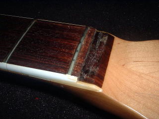バインディングは、ネックの塗装を剥さないように慎重に剥していきます。非常に神経を使う細かな作業です。