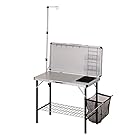 今までのキャンプは調理台がわりに小さなテーブルを使っていましたが、狭いし調理小物の置き場所にも困りました。  そこで今回はキッチンテーブルを用意。   調理器具の格納ポケットがたくさんあるので整理整頓も万全。   ランタンスタンドやゴミ入れ網も付属していてやはり専用キッチンテーブルがあると便利です。