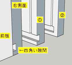 この上に扉板を張るので問題はないが、隙間を出したくなかったら、②のように溝を最後まで掘らず、底板が差し込まれる深さ以上で、かつ突き抜けない位置で止めれば、 表面からは塞がって見える。