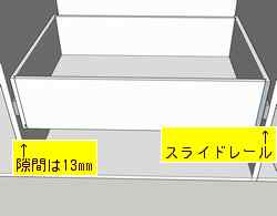 スライドレールの厚みは12.7mm。 誤差も考慮し引き出しと壁の隙間は13㎜にしておく。 レールの前方位置は木口と合わせる。