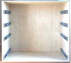 スライドレールの取付位置は側板のセンターより下に。 いちいち図るより治具を充てる方が楽。 レール本体側のレールは箱にする前に付けておく。 前後の位置は本体側とツラ一。
