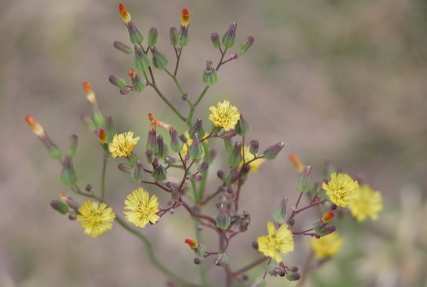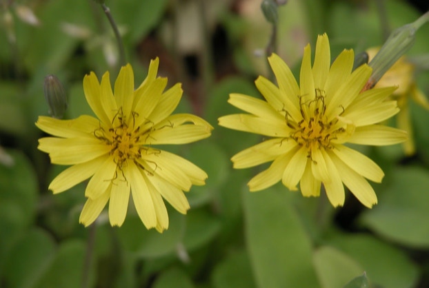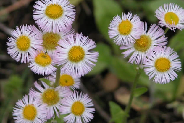 写真中の花が咲いているのはハルジオンで、咲いていないのがヒメジオン(中央横並び)。