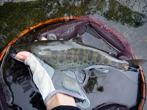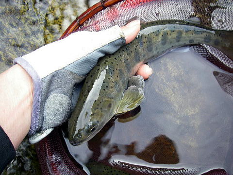 流れの中で強いアタリを感じながらもキャッチできず、次の白泡と白泡の狭間で6寸をキャッチ。
