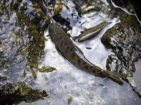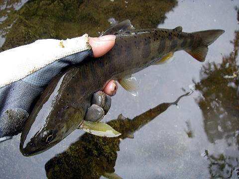 ポイントを移動し小さな落ち込みを狙ってみると、すぐさま7寸サイズがヒット。