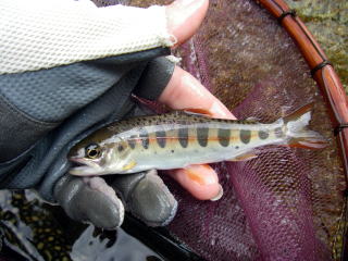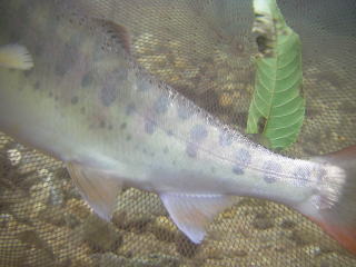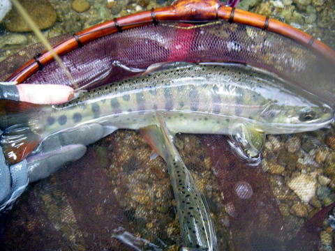 綺麗なヤマメをネットイン。そしてメインポイント。探れども探れども反応がありません(おかしいなぁ)