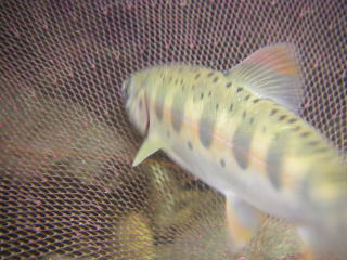 強い流れ込みの中に帰ろうとするヤマメを慎重に引き寄せて無事にネットイン。