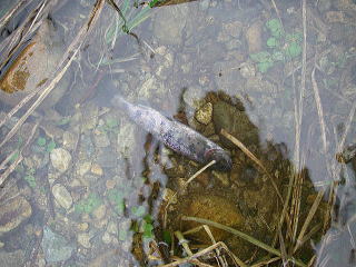 ふと、降り立った川辺に1匹のやまめ・・鳥に狙われたのか身体には齧られたような傷が。