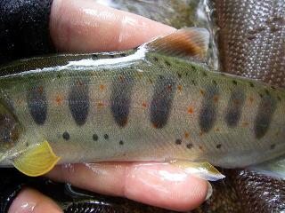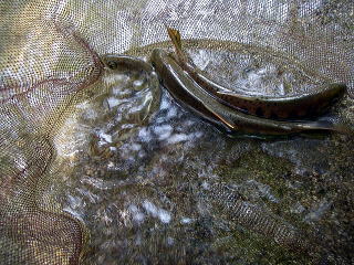無理やり餌を流していると、なんとか食いついてくれました。100メートルの遡行で3匹だけ。