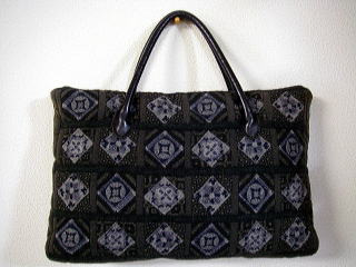 | 小ぶりなバッグ 18p×27p(底12×20) 大島紬柄を使用し、地色の黒布は麻風の 少し目の粗い布で作りました。裏側は総柄 のモチーフ。ファスナー付きです |