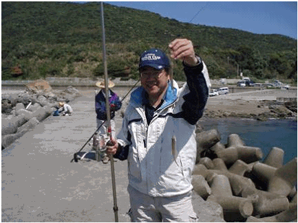 遅れて突堤にやって来た。先端にいる二人は、チョイ投げ仕掛けで釣っていたが近場で釣れたのを見て、此れは本日は釣れると確信して早速投げると・・・