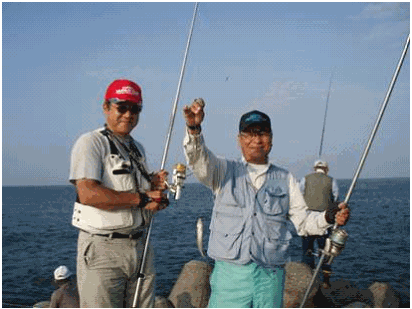早速 釣り談義を始めながら準備をして、突堤先端より沖方向へ投げ開始。???いないな〜? 少しすると、地元の常連さん