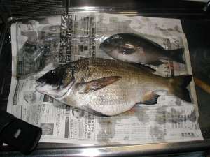 | 赤松遊園地でダンゴを投げていたが、 釣れる気配がない、夕マズメに場所移動を。 日が暮れるとゴンズイのラッシュ。 しばらく頑張っていると、ゴンズイが消えた。 さらに、オキアミがスパッと半分に切られる。 もしや、いや、そんな教科書通りのことなど。 ウキがゆっくりと入っていく、 アワセをいれたらずっしりと胴にのった。 タモ入れ成功、チヌだ、しかもでかい! 50cmあるかとおもったが、少し足りなかった。 うちのおかあちゃん、 袋からはみ出た尻尾を見た瞬間に悲鳴。 頼み込んで料理してもらったが、不味い。 うちの愛犬の餌に。 以後、我が家では黒鯛持ち帰り禁止に。 リリースしてやればよかった・・・。 |
