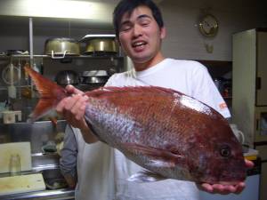 | とにかく正体を見たい。 その一心で巻き続けた。 オヤジ:「おい、魚をそっちにもっていくなよ!!」 オレ:「わかっとるが!いうこときかんのよ!!」 そしてついに力果てて海面を割ったのは桜色の魚影。 いつもの下品な出っ歯の赤いやつではない。 昔、釣りたくて仕方なかったやつをついに仕留めた。 |