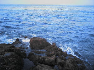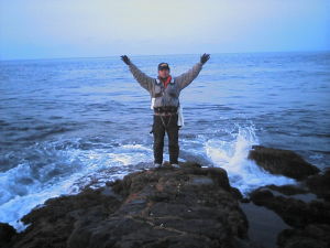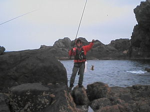 | やばい磯際。 これで釣れなきゃ、もうだめかな。 M先生は磯際でウツボ戯れてる。 ぼくは本流筋のカツオと格闘。 |