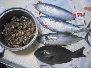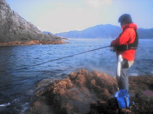 | (ぼくの仕掛け) 本流:制覇2号HR、道糸、ハリス3号、ウキ3B、潮受、剣華グレ8号 磯際:Gチューン3号、道糸、ハリス4号、ウキG3、剣華グレX8号 (ぼくの餌) ボイル3枚 |