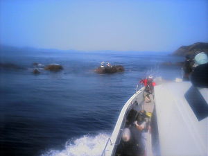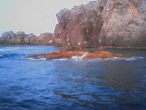 | 最終ステージ、ついにきました超一級磯、 コデ島のハナレ。 そして中泊のグレのごとくブクブク太って しまったぼく。 これは釣るしかない。 |