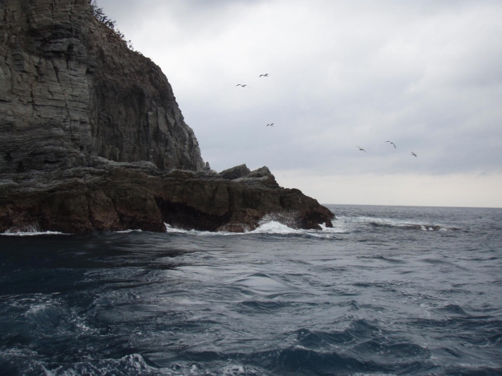 | 南西からの前線を伴う低気圧の接近とともに、 西高東低の気圧配置が一瞬緩み、 1日だけ離島の磯へ渡るチャンスができた。 1泊2日の神津島遠征をやめて、 土曜1日だけの鵜渡根にかけてみた。 ウネリはないが、東の風が強い。 船長がいつ新島方面へと舵を切ることか、 ドキドキしていたけれど、 船室から出るとそこは鵜渡根だった。 |