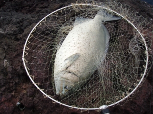 | けど、瞬時に竿を投げ出したらしく、 磯に手をついてかろうじて転げ落ちずにすんだ。 高い音とともにタモが真っ二つ、 ロッドはプカプカと海面に浮かんでいた。 魚の入ったタモを引っ張り上げ、 魚のついた糸からロッドを回収。 とりあえずタモが壊れただけで助かった・・・。 |