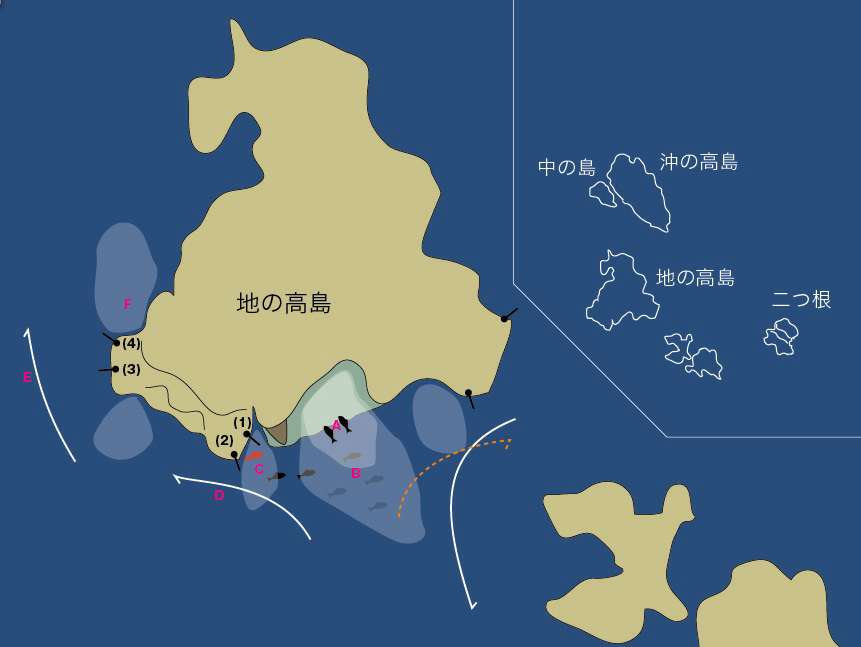 | 【ポイントE】 ミスターKが(3)から右前方を釣っていたので 「M先生がここで52上げたんだよ」と教えると、 仕掛けはバッチリ潮目にそって流れていき、 一発でイサキがかかりました。 |