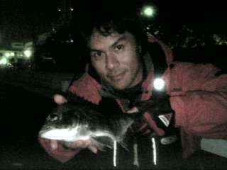 | 帰りたがるGT君をM先生が半ば強制的に、 根岸湾へ。お約束のコースである。 そして、開始から30分あまり、 GT君がついに黒鯛をしとめた。 ストイックに狙い始めて1年と半年、 しかも40cmオーバー。 思わぬ結果となった。 |