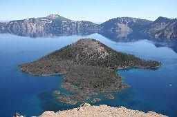 | クレーター・レイクは、オレゴン州南部、標高約2400mの山頂に位置するカルデラ湖。 水深約600m、アメリカの最も深い湖で、世界第7位、透明度は約40m、オレゴン州の25¢コインのモデルにもなっている。 |