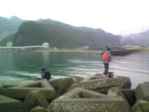 | ダンゴの周りには、真っ黒になるほどのエサトリ。 再び先端に移った。夕まずめと満潮が重なる。 ネリエでがんばるM先生とともに、 ウキが入り始める。33cmまでのメジナ、バリ、 ボラ。 ダンゴが割れてから、棒ウキに反応がでるまで、 全神経を注ぎ、そして、アタリだけを見極め、 居合いのごとく、アワセを入れる。 なかなか美的な釣りだとおもう。しかし、 12時間握り続けると、全身が痛い・・・。 |