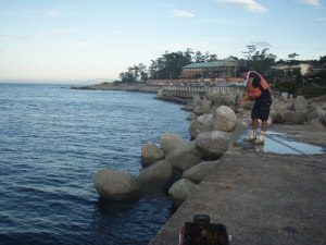 | 最初に竿を曲げたのは、 「キョウイチ君」こと、10cm程度のアイゴ君。 今日一番の引きになるかもしれない、 と、ハマちゃんが名づけた。 カワイイものだった、最初の一匹までは。 このキョウイチたち、ダンゴをいれると、 まるで茶色い竜巻きのように、群がってくる。 |