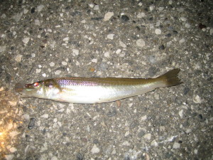 | 日時:8月1日(土)19:00〜翌3:30 場所:三崎港・通り矢堤防(先端赤灯付近) 釣り方:投釣り エサ:イワイソメ、青虫 西伊豆にリベンジしに行くはずが、出発が遅れたので急遽三浦に変更。 当初、観音崎小突堤で竿を出そうと思ったところ、なんと最近護岸工事をやったらしく、先端部分は立ち入り禁止に。。 そこで計画変更し、約8年ぶりに三崎港・通り矢堤防に向かう。 先端にはルアー師が先に入っていたが、「日が落ちたら帰るよ」ということで快く釣座に入れてもらった。 釣り始め1時間くらいで大きなアタリがあり、慎重にあげてみると、やや大きめのシロギス(24p)をゲット。 三崎名物、「チンポセイドン(俗称)」のオマケ付き。そこへちょうどタイミングよく、近くで竿を出していた管理人Aとハマちゃんが登場。 カイトのすばらしい釣果に触発されて俄然エンジンがかかる。 |