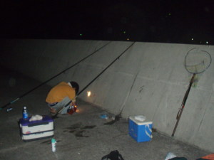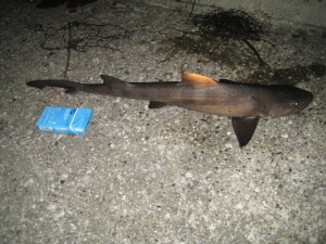 | あがってきたのは70センチくらいのサメ。 ここで最後のイワイソメも打ち尽くし、 3時半頃に納竿。 教訓:虫よけは必須 (無いとブヨがひどくて釣りにならん) |