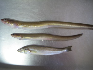 | が、キスがなかなか続かない。30p級の小サメばかり食ってくる。そのあとはゴンズイtimeが続く。 あいまあいまに、竿先を大きく「ブルルン!」と動かす典型的な大キスのアタリがあるが、なかなかハリに乗らない。 そうこうしているうちにエサも無傷で戻ってくるくらい食い止まり、教科書通りに「アオマム」攻撃を開始 (関西でイワイソメのことを「マムシ」と呼び、 においで誘うマムシと動きで誘う青虫を2匹掛けして食いを誘う釣法)。 「アオマム」が功を奏したのか、直後に白ピンクのマアナゴ(48p)を追加。この時点で時間は既に23時。 半夜のつもりが、当然のごとく延長戦に突入。その後、エサ取りの小サメがまた食い出し、イワイソメ1本に戻す。 キスらしい軽快なアタリが続いて出るが、ハリに乗らない。。「三崎は丸せいご13号でも大きいかも」と思いつつも、 あくまで本命はマダイということで粘る。 すると、2時過ぎ頃、竿を大きくゴンゴン叩く今日1番の大きなアタリが! 既に走っている様子ですぐさま大アワセすると「ズッシリ」と乗った。久々のすさまじい引き、強烈な絞り込み、 「やっとマダイか!?」10分以上のやりとりでウデがつりそうになりながらもようやくあがってきた物体は、 何やら色が黒く、デカく、細長い。。。 |