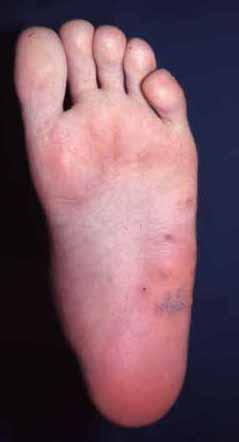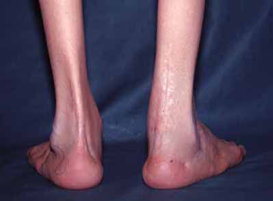 先天性内反足で保存療法後、後方解離などの手術を受けましたが、軽度の変形が残存していました。小学校入学時より野球を始めましたが、その頃から足が腫れたりしています。9才時には足底のしつこい痛みが生じています。写真は14才時のものです。一目では分かりにくいのですが、両側の踵がわずかに内反しています。歩行時体重が足の外側に多くかかっているため足底には有痛性のタコができています。