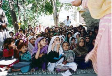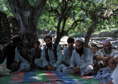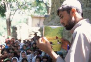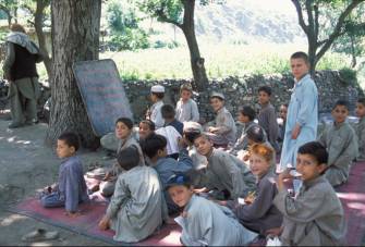 スタン村。男の子たちが木陰に並んでいた。青空教室だ。男の子たちは小川近くの木陰のわずかな平らな土地で、女の子たちは、もう少し道を上った木陰で勉強していた。先生たちは全員男。先生たちは、みな立派な髭を生やし、神妙な面もちをしている。哲学者のようでもあり、銃を持たせたらムジャヒディンの戦士になりそうでもある。小学校の先生というイメージではない。特に「絵本のお話」なんて、この人たちがやったら、てんで不釣り合い・・・という感じの人々ばかりだ。