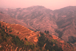 村へ着くまでの道。一山二山越えて行く。なんという天まで続く棚田。梯田(ティーデン)という。山の傾斜が、山頂から谷底までずっと梯田になっている。田植えの後や収穫の頃は、さぞかし美しいだろう。天水田だそうだ。ものすごい傾斜なのに、それが全部段々になり耕されている。全部手で耕して出来上がった景観。お茶が横並びに植えられているところもある。きっと土壌の流出を防いでいるのだろう。稲はもう刈り取られた後だが、その後に野菜を植えているところもある。圧倒される景観。すごい。この人の力のすごさ・・・そんな圧倒される思いとともに、きっと、ここまで耕さないと食べていけないのだろう・・・という中国の莫大な人口が土地にのしかかっているような・・・そんな思いも感じる。平野で土地をもてない人々が、山々まで耕しつくしている。
