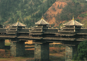 村に到着。程陽郷というトン族の有名な橋がかかる代表的な観光地である。トン族の屋根つきの橋を渡っていくと、橋の両側には、どこの観光地とも同じようにハンディクラフトがかけてあり、つい見てしまう私はおばちゃんたちにどんどん引き留められる。小平はずんずん先に行ってしまう。