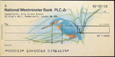 口座を開設しました、ナショナルウェストミンスター銀行ハマースミス支店へJ社総務のHさんと出かけ、初めは書類を記入して出せば通帳とカードが発行されるものと思っていたらどうやら様子が違います。 まずさんざん待たされたのち、やっと担当者が出てきて別室のような部屋に通されました、そしてまるでHさんを通訳とした面接のような雰囲気で担当者とのやり取りが始まり、最後に書類の記入を求められました、僕は書類に住所氏名と電話番号等を書きこみます。 最後にサイン欄があったので、僕は”T.Honda”ときれいな活字体で記入しました。すると担当者は困った顔で何か言っています、どうやらきれいな活字体では簡単にまねされるのでサインとしてはふさわしくないと言っているらしく、Hさんのアドバイスで僕はその後ろに続けて少し崩した漢字で”本多 司”と記入しました、すると担当者は納得した様子でにっこり笑って「OK」と言いました。 おかげで僕の銀行のサインは”T.Honda 本多 司”というへんてこなサインになってしまいました。こんな事なら初めから漢字だけにしておけばよかった、と思いつつも、預け入れとして50ポンドを渡して手続きは無事完了。 Hさんに尋ねるとイギリスの銀行は預金通帳というものはないらしく、代わりに明細が毎月郵送されるとの事、またいろんな支払いや預金の払戻は小切手で出来て、それも後日郵送されるはず、との事です。 はたして数日後、銀行から小切手帳と最初の明細書とそれをファイリングするバインダーが郵送されてきました。 銀行口座ができた事でやっと給料を送金してもらえるようになりました、給料は支給額を全額ポンドに換金してこっちの口座に振り込んで下さいと会社に連絡しました。 (今思うと為替手数料で随分損したような気がしますが・・・) で小切手の話、今ではどうなのかわかりませんが当時のイギリスでは小切手がごく一般的に(おそらくクレジットカード以上に)使われていました、たとえば店で買い物をして、その支払いに小切手をきっている人をたくさん見かけました。 電気代や電話代なんかを支払う場合は、請求書に同封されている返信用封筒に料金分の額面を記入した小切手を同封し返送すればそれで支払いが出来ます。 それに使い方によっては、友人同士の日常のお金のやりとり、たとえば割りかんの飲食代の清算に小切手を使えば、現金の持ち合わせや小銭を気にする必要がなくて便利です。 そんなことより、日常小切手を使う習慣のない日本から見ると、小切手をさらさらと書いてピシッと切り離して支払うなんて、なんだかかっこいいじゃありませんか。 ちなみに図柄は普通のやつと、動物シリーズが選べます(僕は絶対動物シリーズ!) ただし、残高をよく確認して不渡りに注意しましょう! |