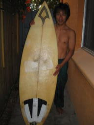 実はこの一週間ほど前に海でマイボードが盗まれて(自分のドジで)、帰る日までシシ君がくれた右のボードでサーフィンしてたんだけど、使うたびに壊れていった |